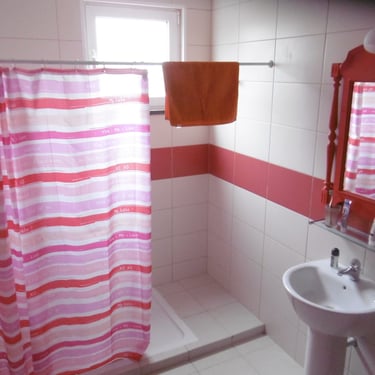 Ein Badezimmer hat direkten Zugang vom roten Schlafzimmer