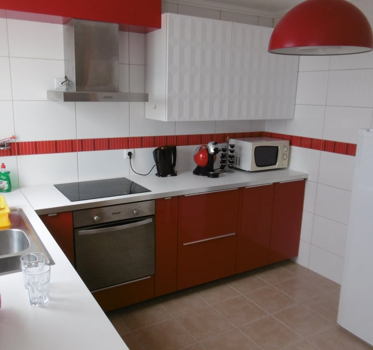 Küche mit Kühlschrank, E-Herd, Ofen, Toaster, Kaffeemaschine, Wasserkocher, Mikrowelle